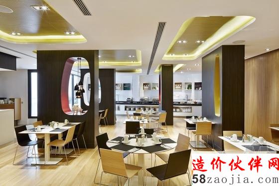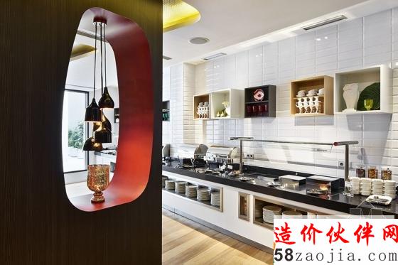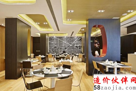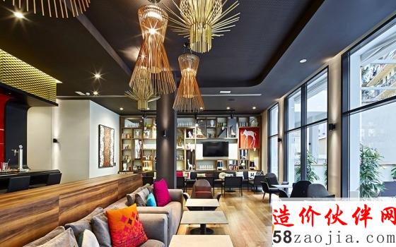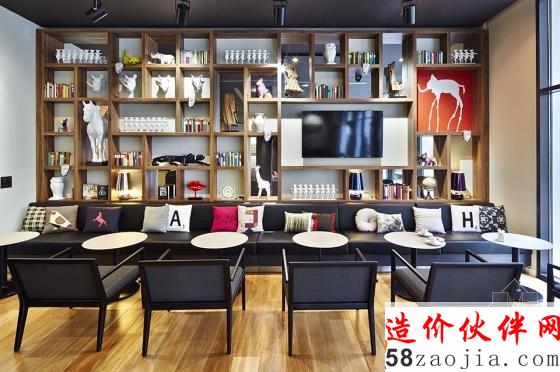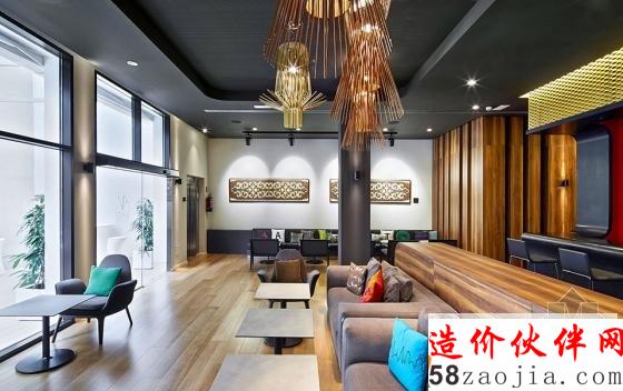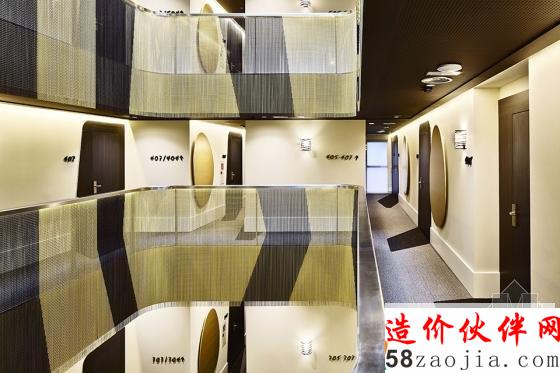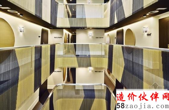 酒吧由黑色可丽耐打造的连续台面与金色墙面还有红色墙面形成撞色。餐厅的移动装饰墙可根据需求实现灵活划分空间。绝大多数客房都有着统一的装修风格,折弯的木材状造体从床头蔓延,到达天花,内藏灯光,并与床头储物合并为一个整体。金色与灰色为房间主色。