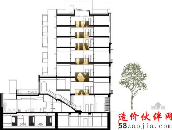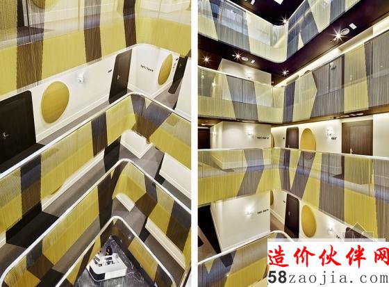 自然光充满酒店中庭。金色金属链上的黑色图案也蔓延到地板墙面,整体形成一个统一的金色空间。金色的铝链条安放在扶手栏杆外侧,黑色的图影穿越而过。扶手栏杆内侧的LED光源让这金色帷幕更加闪耀。