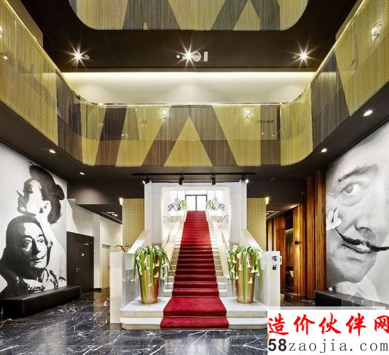 进入酒店,首先是一道铺着红色地毯的大理石白楼梯,两侧的装饰画是超现实主义画家萨尔瓦多·达利与他妻子的头像。抬头,便是这个酒店的金色中庭。金色是该酒店的基色,出现在各个地方,与各种材料以及色彩形成对比。呈现出低调奢华感。