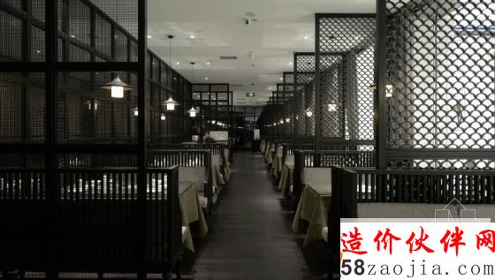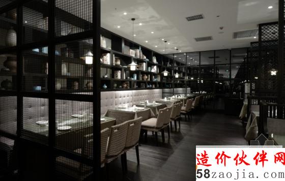 吧台前面是等候区,规划了两组舒适的沙发,人性化的设计提升了整个餐厅的服务品质。鱼鳞状的木隔断很好的把前厅和走道分开。正对前厅的走道摆放着一条简简单单的长条案,随意的几件土陶罐,再加上墙上的一根枯木装饰,在射灯的照射下,现代中式的主题回荡在整个餐厅。