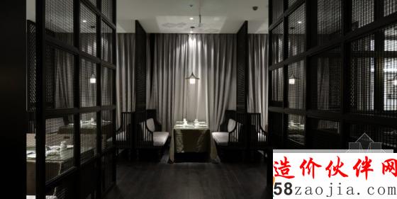 等候区的后面是散座区,米色、黑色的家具搭配咖啡色的布艺,含蓄素雅。鱼鳞状的木隔断将散座区有序的隔开,即不影响整个空间的视线,使空间隔而不断,又保证了用餐的私密性,使每桌客人用餐时都互不干扰。而墙面黑色方管与银镜组合的造型,在视觉上延伸了空间感,两者相互结合,营造了一种和谐的用餐环境。在散座区的角落里,还规划了几处景观。