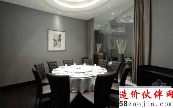 包间摒弃了复杂的造型,灰色的藤编壁纸装饰着整个墙面,圆形的吊顶和圆形的餐桌相互呼应着。设计师将景观延续到了包间,给单调的包间增加了一点活力。