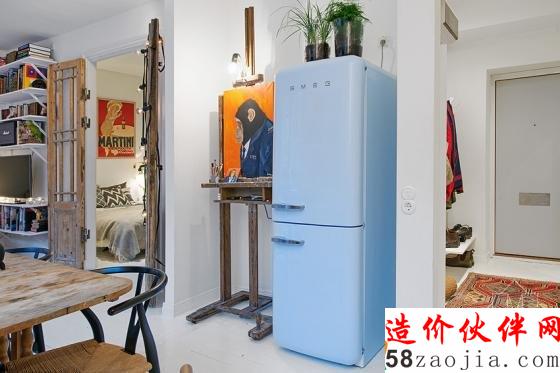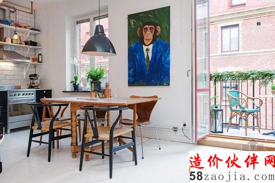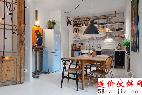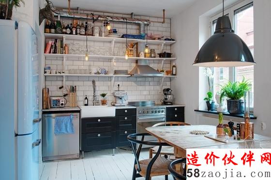 来自瑞典推出的12坪公寓,厨房黑色收纳柜和不锈钢家电带出轻工业风,利用外露管线,随意缠绕的单颗灯泡,演绎出小酒馆沉着气氛。白色开放式层板和瓷砖衬托下,锅碗瓢盆与酒瓶俨然成为墙面最棒的装饰品。想要在家独享小酌空间吗?不妨在厨房的一角,利用复古、轻工业元素,混搭出属于自己的小酒馆风吧!