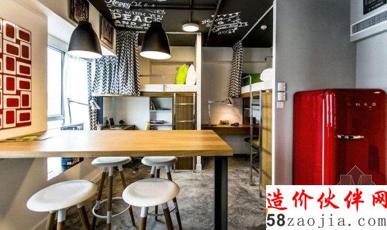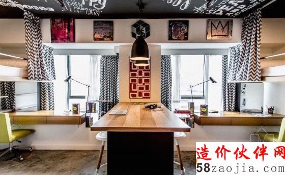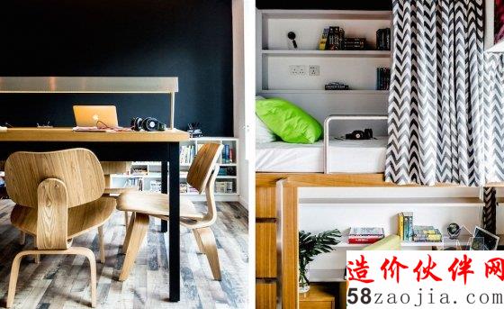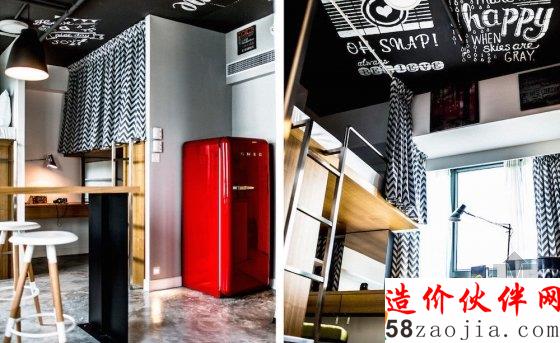 每间61平方米的公寓被改造为4人间,采用了很多学生宿舍都会用到的上床下桌配置,钢质爬梯的上部用遮光窗帘保证了入住者睡觉时的隐私,下部除了一个内置的写字桌外,另配有内置式储存架、挂衣杆、带锁的抽屉以及多插槽的USB集线器。