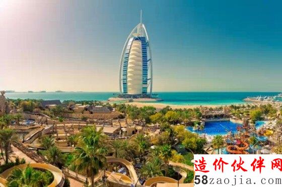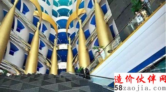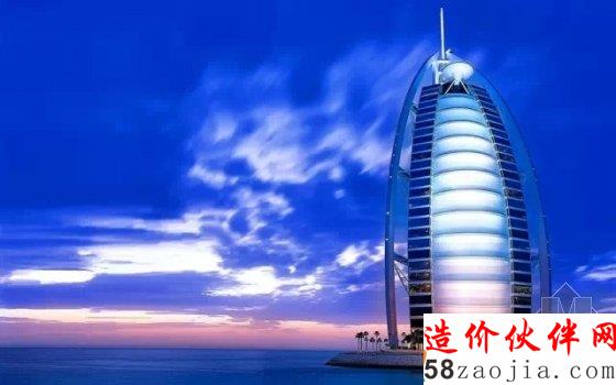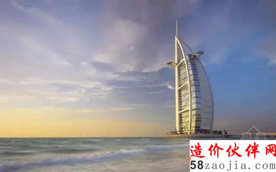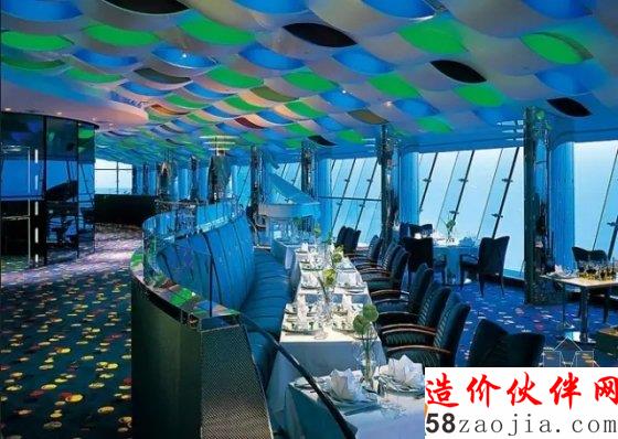 饭店由英国设计师w.s.atkins设计,外观如同一张鼓满了风的帆,一共有56层、321米高,是全球最高的饭店,比法国埃菲尔铁塔还高上一截。