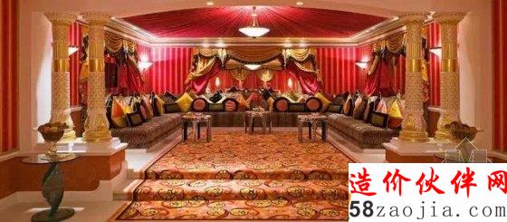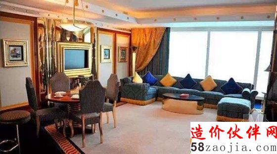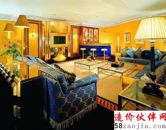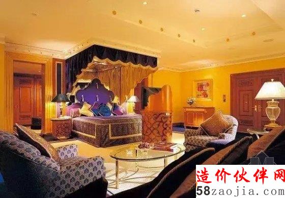 它拥有202套复式客房,最小面积的房间都有170平方米,最豪华的是780平方米的总统套房,在第25层,家具是镀金的,设有一个电影院、两间卧室、两间起居室、一个餐厅,出入有专用电梯。最低的也是总统套房房价要900美元,最高的皇家套房则要18000美元。实际上这是在淡季的最低价,按这个价格往往是订不到房的。