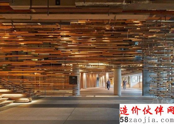 这个大堂是酒店一楼两个入口之间的过渡空间。成千上万根长短不一的木材组成阵列,从天花板上悬挂下来,包裹住墙壁,或是由钢丝串联起来作为装饰。比起传统那些充满木元素的空间,这个酒店大堂多了几分戏剧化的感觉,似乎粗糙而不事加工,又好像很精巧复杂。尤其当阳光穿过木条间隙透入时,整个空间像是最原始的和有未来感的事物碰撞在一起。它让你觉得有些陌生,但这是从积极意义上说的。