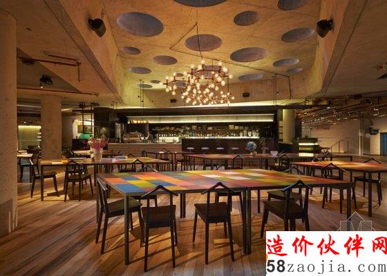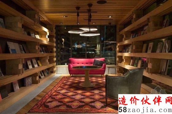 酒店的公共空间包括接待处、图书馆、餐厅和厨房。可以看到交织的混凝土块在这里堆叠。天花板也是木质的,但比起前卫的大堂,这里的木天花板显得柔和得多。