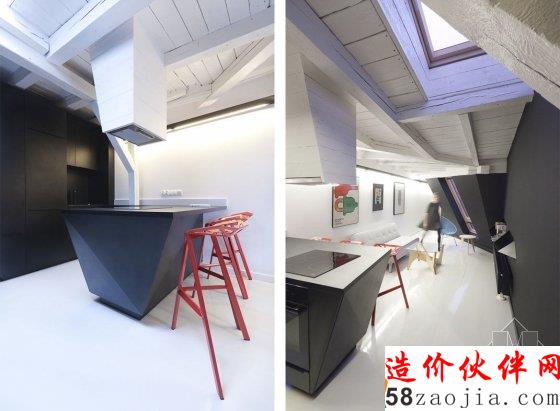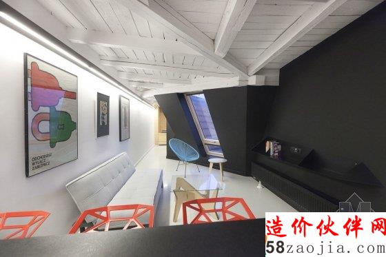 这其中关键一步就是把斜屋顶形成的复杂结构和其他不规则的边角空间都涂成黑色。这样一来,公寓的风格就向造型独特的现代艺术靠拢了。部分家具和浴室外壁也都为黑色、不规则的几何形状,使这种风格保持连贯。而为了避免黑色与低矮的天花板带来压抑感,公寓的主体,包括天花板、墙、地面都用白色来平衡,并以色彩明亮的椅子和墙面装饰作为点缀。