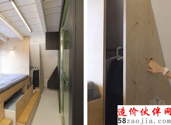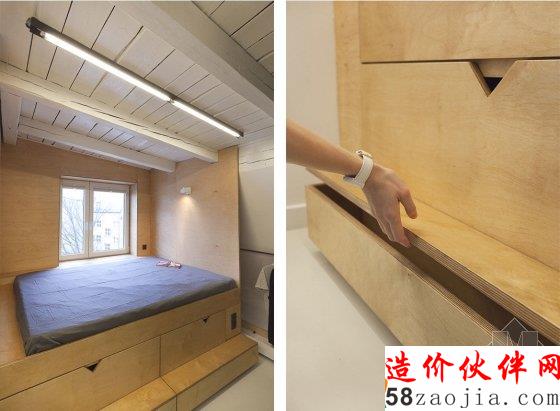 由于阁楼是整座建筑最接近天空的地方,采光和隔热都需要重点考虑。设计师给这里加了隔热层,做法是直接加在屋顶上,保留阁楼原本的桁架结构,这样天花板就不需要再往下压了。卧室的床比一般的床要高,正对着楼顶的大窗户,可以看到外面波兹南的景色,视野很不错。而把床抬升不仅为了看风景,还因为可以增加储藏空间。大木床下有几层抽屉,连看起来像台阶的部分其实也是可以存放东西的。