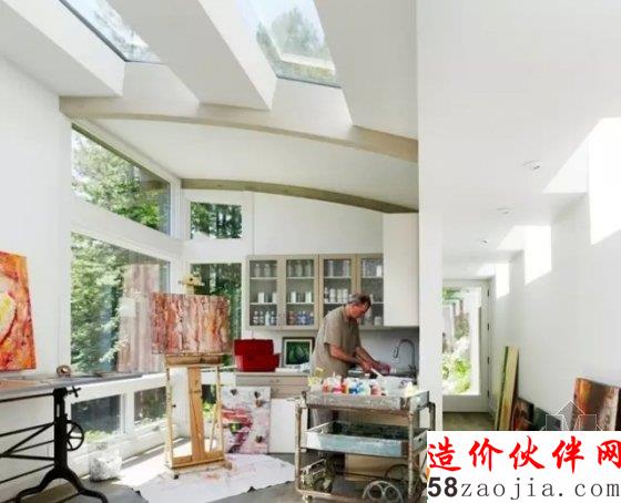 室内风格简单、清新,与周边森林环境融为一体,大大的天窗增加了屋内的亮度,整个空间设计很环保。