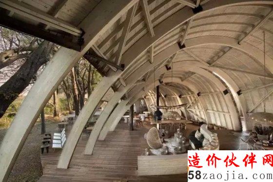支撑酒店的木梁以松木为材料构建出拱形造型,好似“骨架”般呈现出一排排流线型弧度。