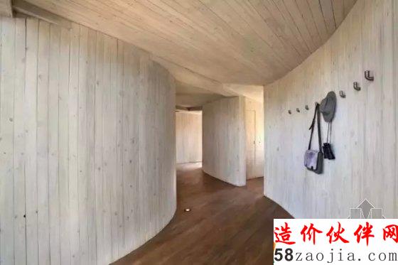 建筑外壳砖混结构,内部装饰也是以木质为主,整体造型有弧度,围合性强,很有安全感。
