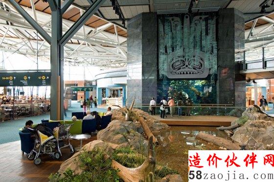 温哥华国际机场是北美地区排名最高的机场,重视环保和可持续发展的绿色设计、超过160家商店、服务场所和餐厅都是让它名列前茅的重要原因。机场里摆放着引人注目的西北海岸原住民艺术藏品,还有六家AbsoluteSpa,国际出发的航站楼里甚至藏着一个室内小溪和游弋着850余种本地海洋生物的水族馆。