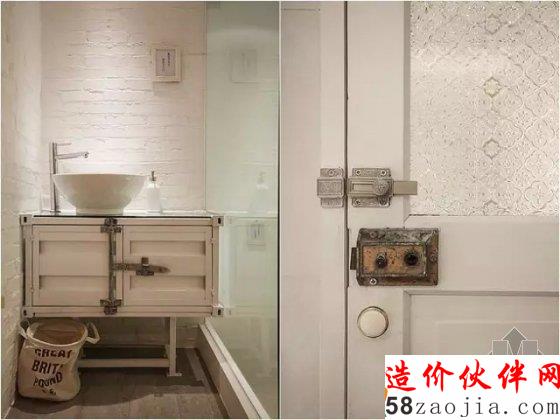 洗手池和门都采用了古拙的配件。洗手间被处理得一尘不染的纯白。