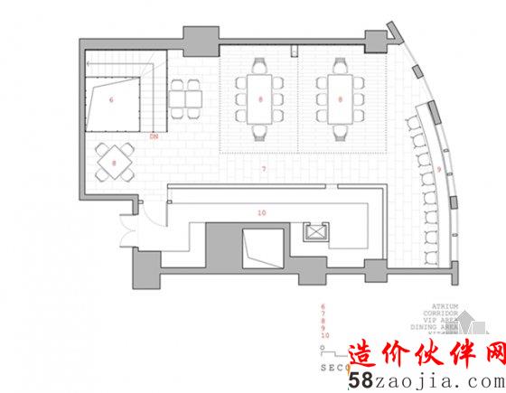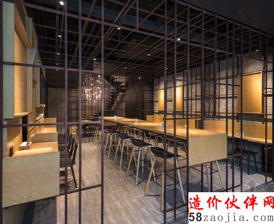 旅程从门厅开始,两个通透窗口将厨师备餐与食客用餐的丰富景象分别框显出来。食客经由厚重的铜边锈铁大门进入,可以看到不同的用餐区域各得其所。裸露的原始墙面,锈铁框架,木质桌椅与壁龛,设计师运用统一的材质和元素营造了三个不同的空间。第一个架子里设有三排长桌与,最适合繁忙的白领一族;第二个架子里配有长沙发和雅致的装饰瓷器,用以招待用心体味美食的慢食客;第三个架子是双层挑高的楼梯中庭,这里不仅可以款待一桌好友,亦可以近距离享受店中的视觉盛宴:长垂下来的标志性“面条”以及悬浮闪耀其中的光影点点。