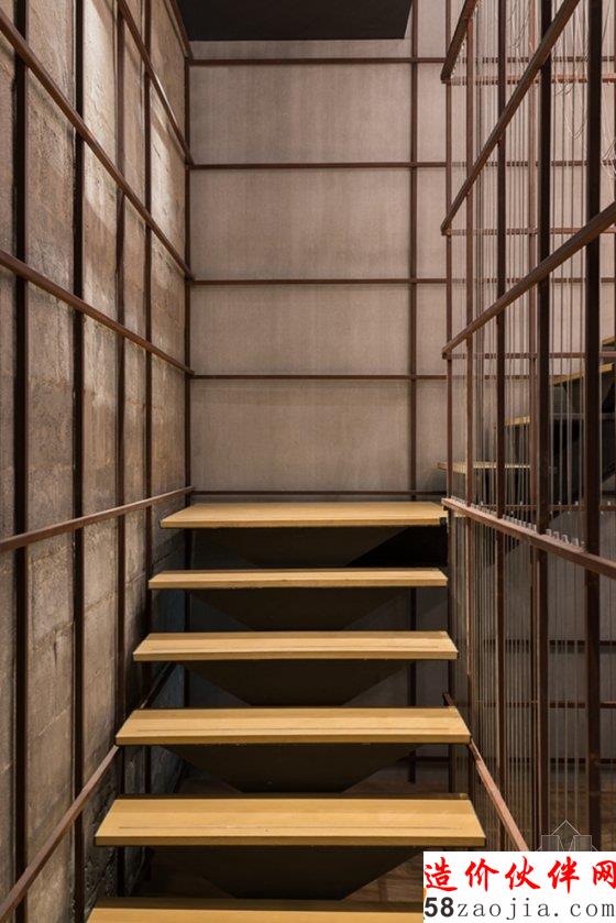 铁架由一层继续向上延伸,沿着嵌于其中的楼梯进入二层包房区。“钢丝面条”在这里经由重叠悬挂规限空间。这些可看穿的虚幕散发着空灵飘渺的气质,令面馆独一无二。