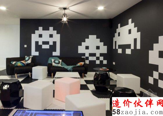 有三位全职管理者帮助运营,可以预定私人活动或派对。公共房间的设计都符合年轻人的审美,很活泼。比如图书室采用全木质的浅棕色家具,书架和靠墙的座位相互穿插,营造温馨而安静的气氛。墙上还贴有黑白色版画风格的卡通墙纸,将空间调和得很轻松。而游戏室的墙面则换成了像素图案,黑白色的家具让空间显得更酷一些,这里适合棋牌类的桌面游戏。这些地方都营造一种出门即可社交的环境,他们想要达到即便是在投币式洗衣房里都不会让人感受孤独。