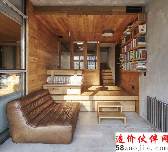 住宅最大的特征是一些区域被“抬高”了,比如整个起居室和卧室的一部分。抬高的地方并不是水泥地面,而是增加了一层木材,与地面形成了的空隙就作为抽屉。据计算,住宅里的抽屉多达57个,加上两个衣橱和食物储藏柜就不再需要任何储物空间。这就为室内腾出了不少空间,不会因为增加柜子而打破原本风格或是显得拥挤。