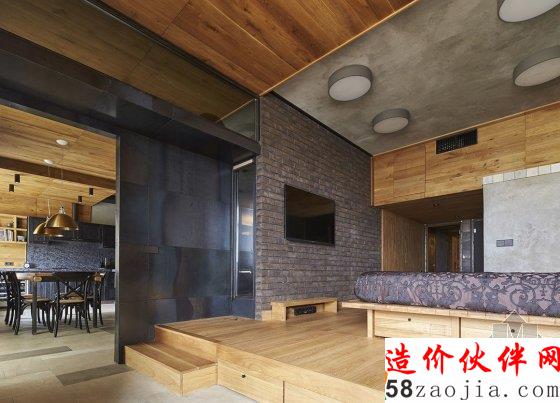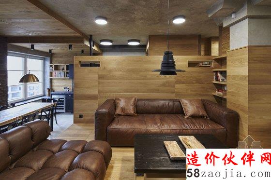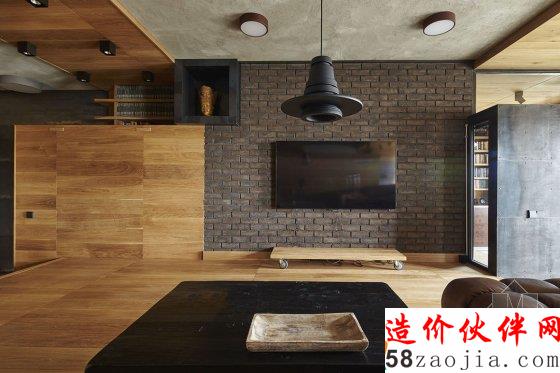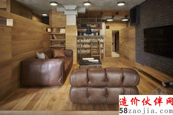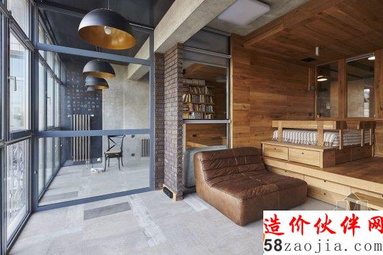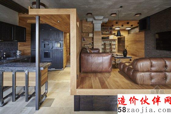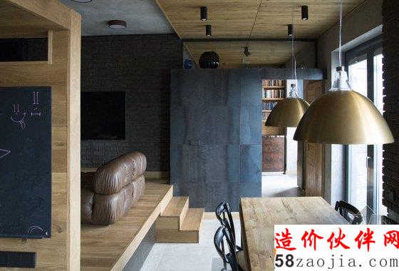 有小孩的家庭住宅常常显得活泼有趣,比如我们多次介绍的台湾设计工作室 HAOdesign,拥有明亮的配色和给小朋友的游戏空间,增加家人和小孩的互动。但这户在莫斯科的住宅倒并不在活泼的配色和增加互动性上下功夫,水泥墙、黑色的石砖、铁框、棕色的橡木板搭配黄铜做的家具和皮质沙发让空间显得硬朗许多。