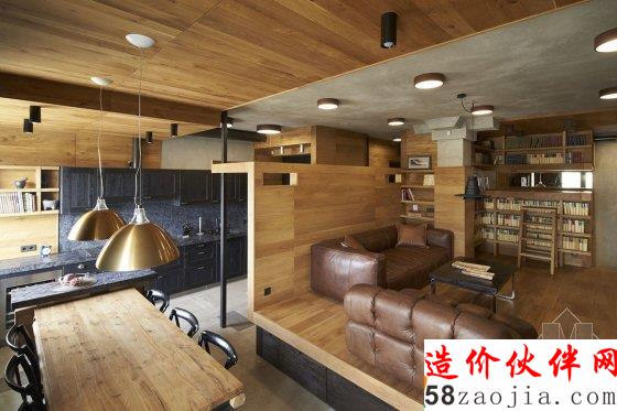 被抬高的客厅在前半部分的正中间,它作为一个家庭中沟通交流的枢纽。客厅旁有一个适合儿童的看书的角落,柜子的中间被“切断”,构成一个看书的桌面,上面的吊柜可供大人使用或者利用移动楼梯拿取,橡木做的地板、天花板、书柜和楼梯将这个空间包裹起来,显得居家而古典。