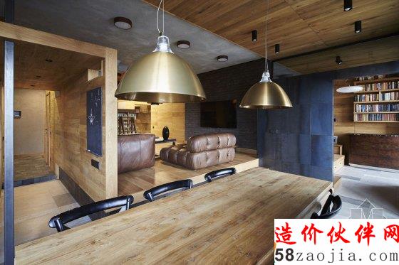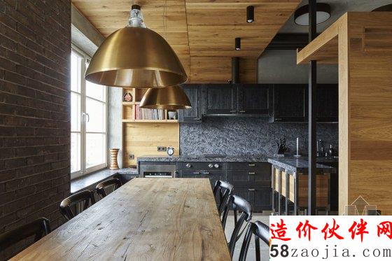 厨房的长度跨越了客厅和餐厅,带有滚轮的橱柜就可以沿着厨房移动到餐桌边,使餐桌加长。餐厅、厨房和客厅都是完全开放的,在这片区域中,棕色橡木做的地板、天花板、桌子搭配黑色的橱柜、餐椅和黑色金属结构,让空间非常古典。这里还配有黄铜灯、红砖墙和皮质沙发,多种元素集中出现却不显得凌乱。