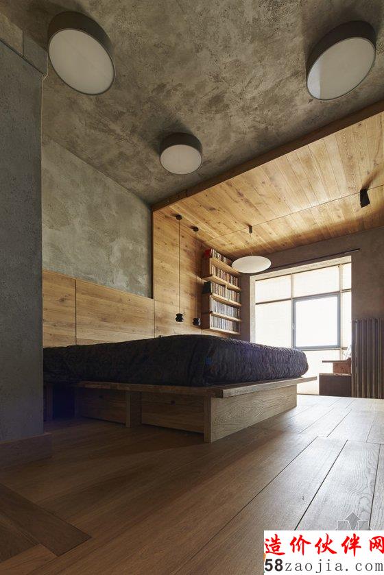 主卧在客厅电视墙的背后,黑色的推拉门将它隐藏了起来,保留了一定私密性。床的下面也做成了抬高的抽屉。