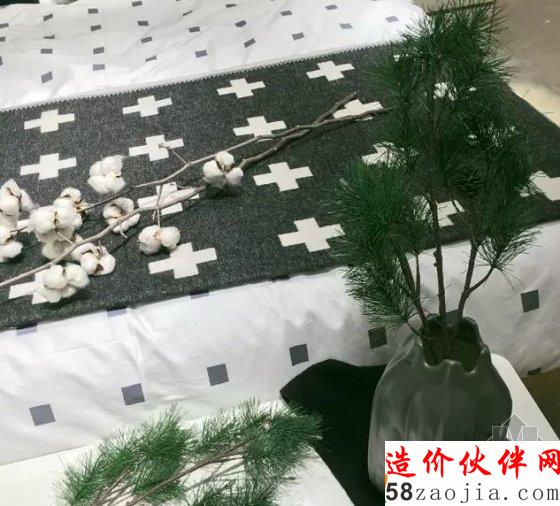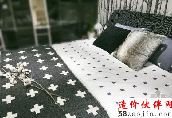 黑色床盖和白色的棉花树枝摆件,产生强烈的颜色对比。床盖选择灰黑色羊毛床盖,搭配白色十字图案。设计简单大方,布料选择也凸显品味