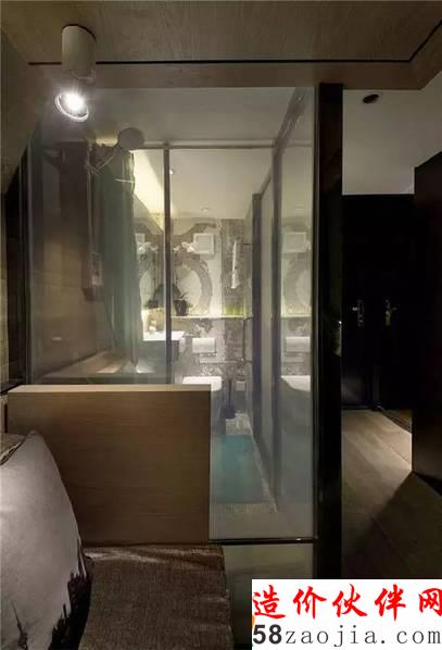 在进门右手边就是卫生间,别以为是如图那样透明的玻璃,这可是设计师安装了一个设备,只要按下开关玻璃就会变成磨砂。