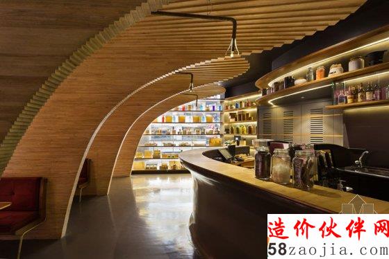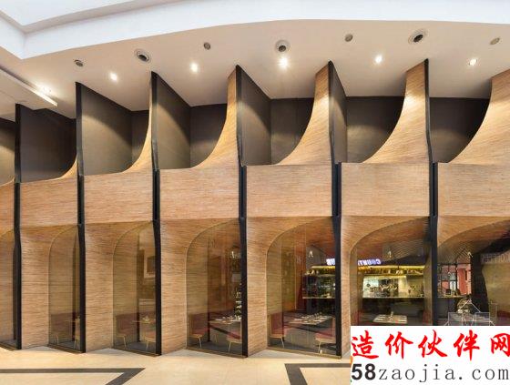 位于印度孟买凤凰城的这家店以木质拱廊为部件来装饰中心。到了内部,你就能更清楚地观察到用塑性木创造出的曲形波浪。