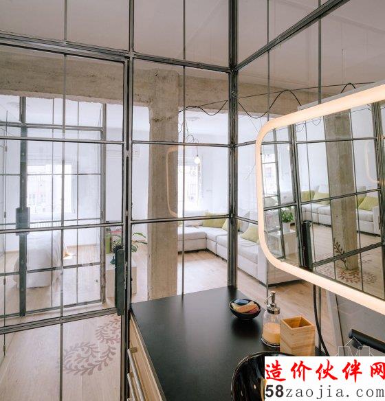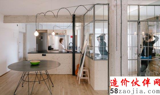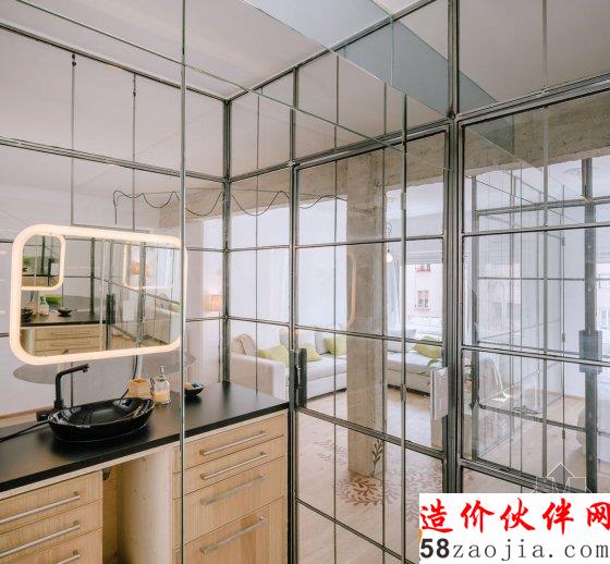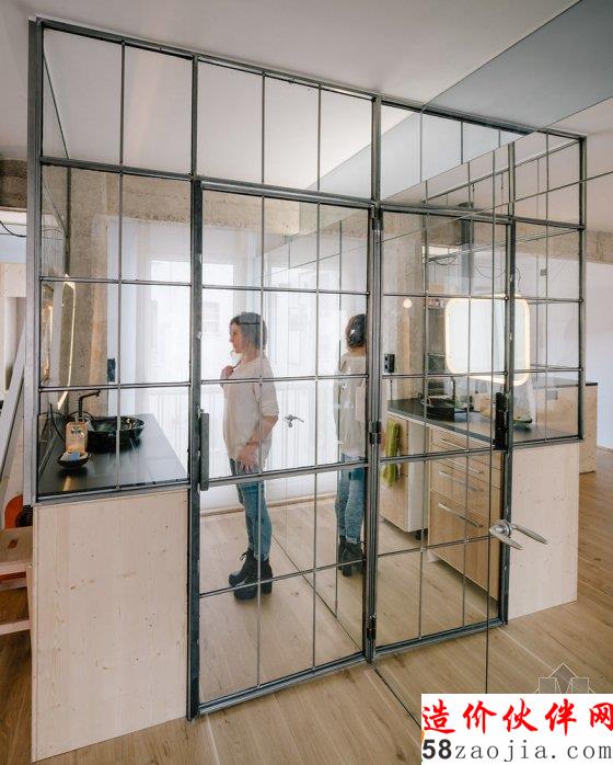 他们选用玻璃墙作为隔断,外框使用一种质地粗糙的钢结构,将玻璃墙划分为大小相同的方形小格,就像是书架的隔断,它的工业感也带给人一种怀旧的气息。两间卧室和卫生间的外墙都使用这种隔断,一共用掉了 166 块玻璃,这样做的效果就是,当你站在房子的任意地方都能看到其他房间的情况,因为玻璃窗都是相同的,经过层层叠加后造成了一种迷失的感受。