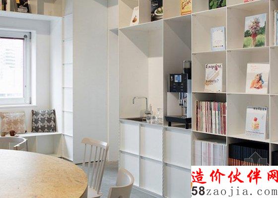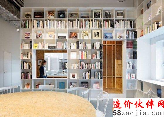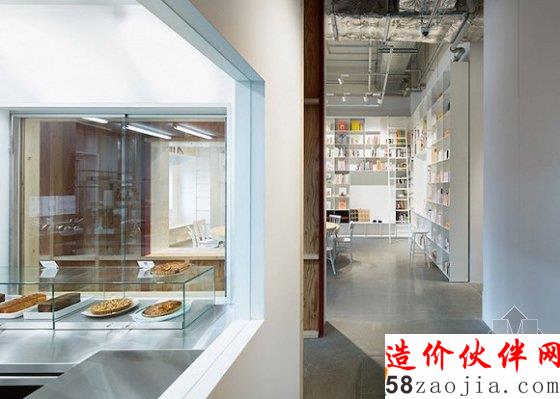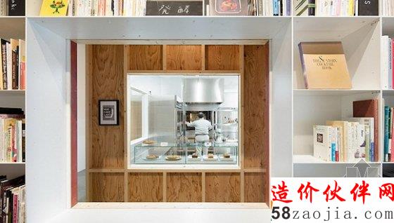 从最后的效果看,设计师想到了在图书馆的书架中间挖个洞,对准蛋糕店厨房的透明展示窗口,把两个空间关联起来。而两个空间中又留出了一道走廊,让空间之间还是有所区隔。