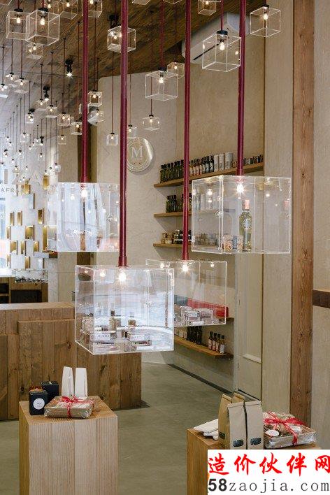 周边区域唤起人们对藏红花的传统的认识。设计师通过色彩和材料来呼应盛产和烘炙藏红花的作坊的形制:石头铺就的地面四周是粉刷成白色的墙体上,墙体上开设着小小的洞口,上方是木头做的天花板。洞口也用作商品的展示,同时在柜台中,设计师使用了同样的设计语汇。