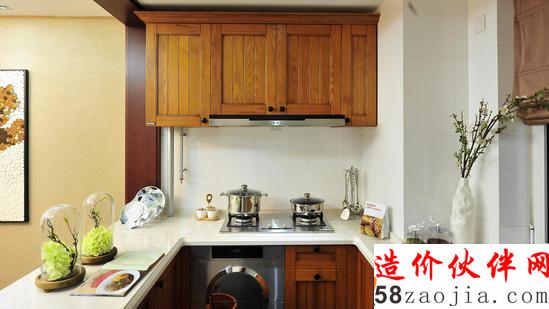 由于厨房空间局促,设计U型橱柜以节省空间,方便多人同时操作。厨房摆点绿植装饰,做饭再也不无聊。