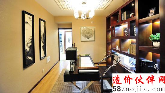 书房的布置简约而优雅,整面墙的实木书架稳重大气,墙上的水墨沙画凸显主人的品味。