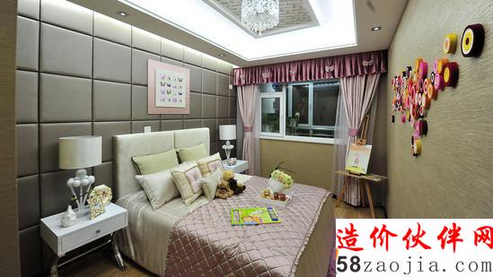 儿童房布局温馨可爱,粉色窗帘搭配粉色床上用品相得益彰,墙壁上的创意装饰画使得卧室充满童趣。