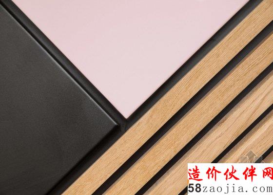 从柜台到天花板乃至座椅区域,整个空间是黑色、粉色涂层钢板与斜纹木板条的组合。黑色与粉色的搭配透着时尚气息,斜纹木板条的大面积运用则与树形成呼应,强化了店铺里的原始自然氛围。