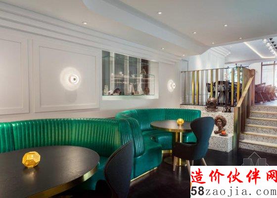 栏杆、酒架、桌面装饰物都用了金色,当然也不能少了 Tom Dixon 代表性的黄铜吊灯,与大范围使用的粉色、墨绿色餐椅拼成了整个餐厅的调色板。