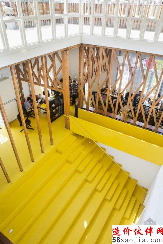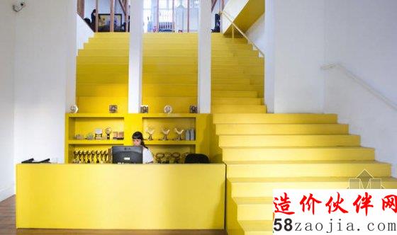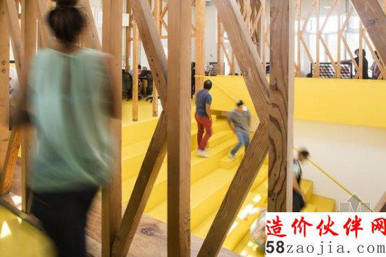 登上这座老建筑的台阶,一个黄色的大楼梯就像地毯一样进入眼中。它占据了中庭的全部位置,让其他房间分布在四周,因而显得格外醒目。在进门处,楼梯的一半位置割给了前台,再往上楼梯就横跨 6 米,像一个大的舞台,可以看到不少人坐在上面讨论或休息。因为一部分台阶的跨度大,走起来需要带着一点跑动。