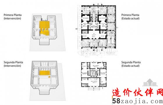 三楼围绕着楼梯安装了一圈木“栅栏”,它有划分空间的作用却没有将它们完全分开,让不同的空间保持连通。这里的层高接近 4 米,垂直排列的木头就给人一种森林的感觉。这个装置称为灌溉系统(Irrigation Systems),是与当地艺术家 Nani Cardenas 合作的。明亮、宽敞的大楼梯似乎带活了沉重、呆板的老建筑,使这里重新变成一个适合年轻人思考创意的地方。