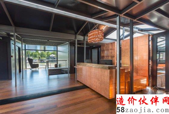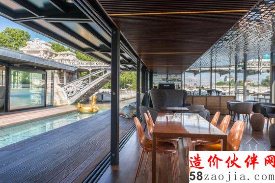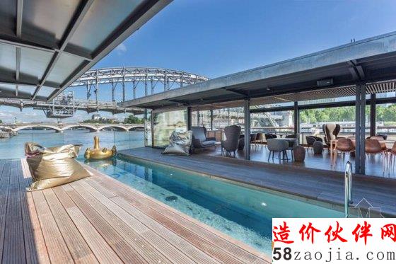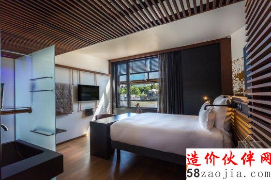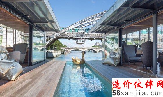 酒店由许多临水的“船舱”组成,一共 58 个房间和、酒吧等公共区域都分布其中。每一个“船舱”的四周是大的落地玻璃窗或可以拉开的门,外面连接着木甲板和一个可以“纵身一跃”的泳池,就像是漂浮在河面上的船。