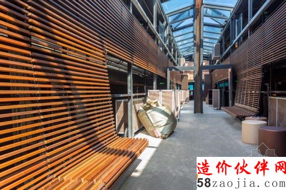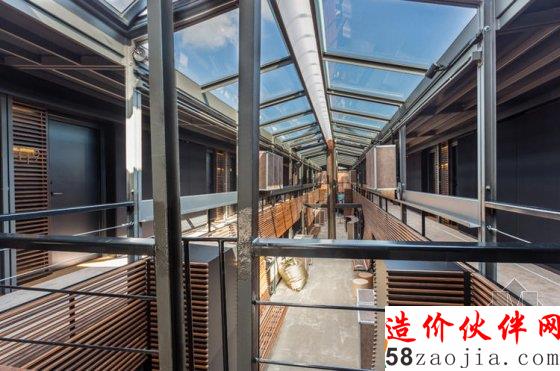 在走廊中,两个“船舱”之间是一排玻璃天窗,它们向两边微微倾斜呈现出屋顶三角的形状。自然光线通过玻璃窗投射下来,天蓝白云的情景也像是带波光的蓝色湖水。