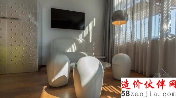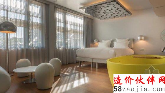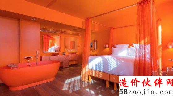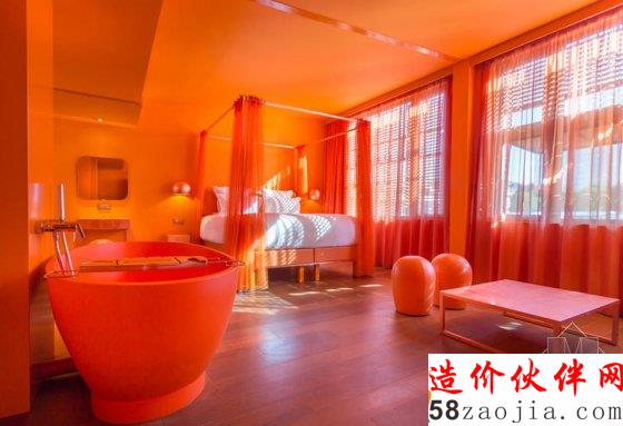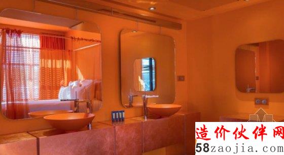 还有一种是设计师房间,比如这间叫“日出”,从墙面到家具以及洗漱间的设施都是橙红色的,让房间处于一种暧昧的情调中。