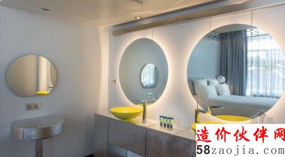 另一间叫“银色”,大部分的家具偏灰,黄色的浴缸和洗手池作为调和出现,让这里在柔和明亮中不乏有趣的色彩。