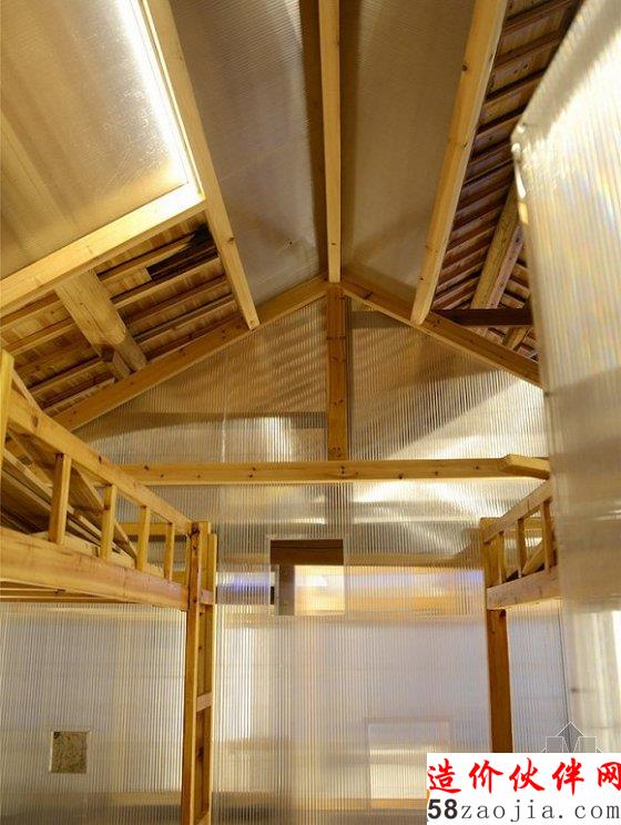 新房子实际上就是一个透明盒子,木头框架、塑料墙体。整个盒子的所有部件都可以轻易被拆除,灵活性很高。而透明的外墙保证了空间充足的透光性,也让整个盒子和土屋不至于完全隔绝。