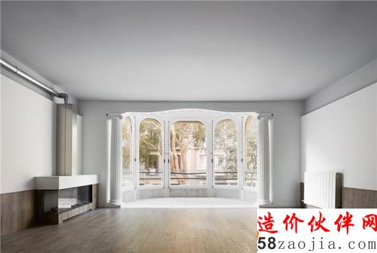 狭长而规整的公寓占地约140平米,平淡无奇的室内空间面临这巨大的转变。临街一侧的巨大玻璃墙面划出一道弧线,弓形窗台为建筑带来优雅的古典气息;而另一端的走廊则紧靠着中庭,开敞的户外空间不经修饰,简单而毫无吸引力。