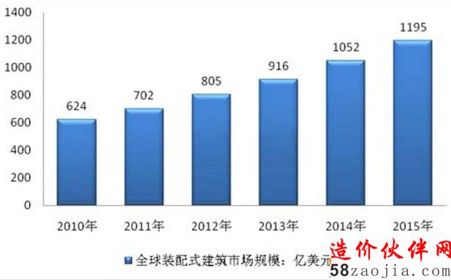 近年来,全球装配式建筑市场发展迅猛,2010年全球装配式建筑市场规模为624亿美元,2015年增长至1195亿美元,市场增速保持在10%以上。