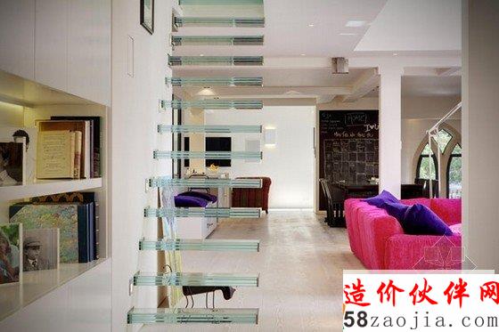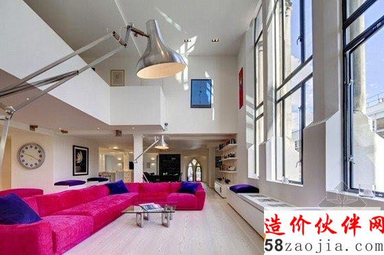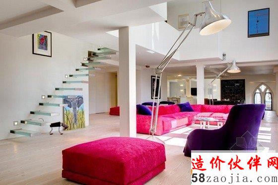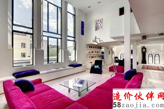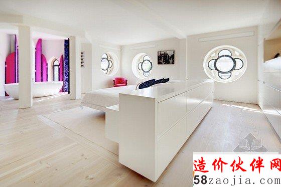 很难相信在教堂内会有一间极具现代化的公寓,设计师创造了一个奇迹。公寓室内设计保持了教堂原有的拱形窗户,白色的墙壁透露优雅之意,粉色和紫色增添了室内的色彩和生机。
