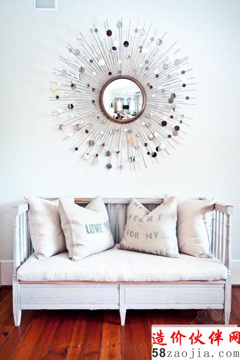 墙上的这面Thomas Pheasant镜子是最初买给自己的几样物件之一。整套房子使用Benjamen Moore的“晨露”作为墙漆,并采用了中式白色装饰。