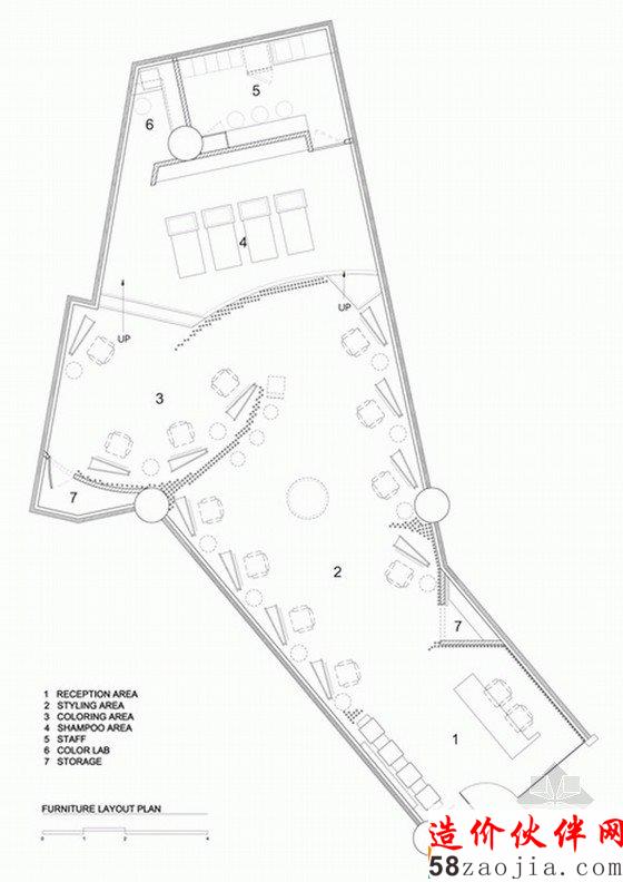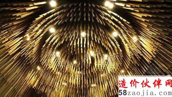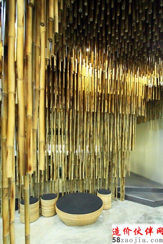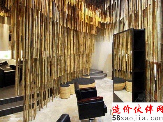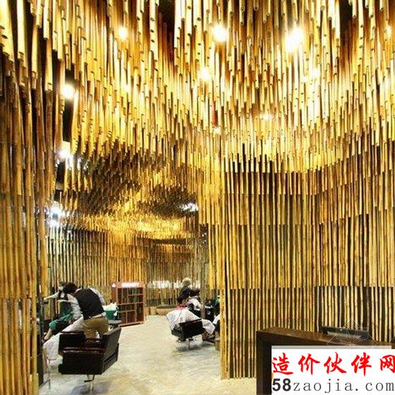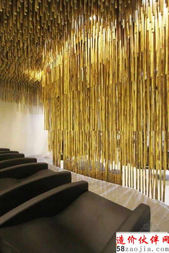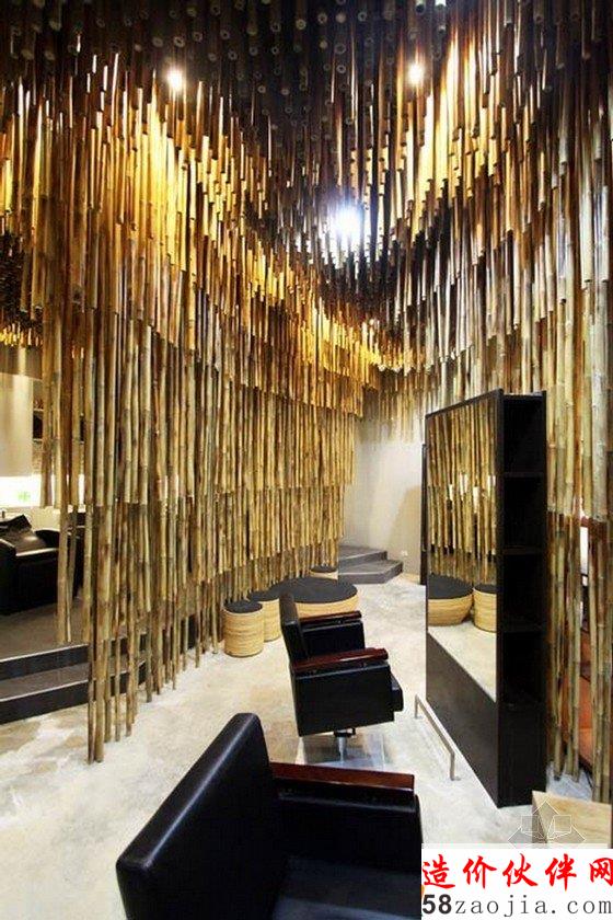 在这间美发沙龙里,上千条竹竿从屋顶悬挂下来,对这里的空间进行分隔。这样装饰的灵感来源于天然洞穴内部满是钟乳石的景象,天然洞穴中,钟乳石和石笋相互链接,形成石柱,甚至整面墙壁,最终将洞穴分隔成带有多个独立小空间的事物。密集的竹竿将洗发区和染色区与开阔的公共区域隔开,具有屏障和帷幕的作用。